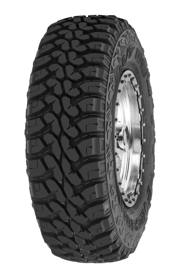 Aggressive off-road tread with stone ejectors and reinforced sidewall protectors. Maintains stable highway performance with variable pitch tread design.